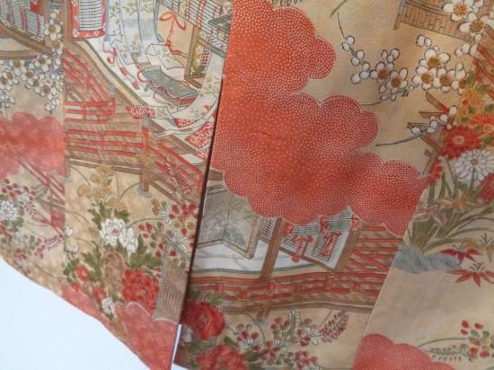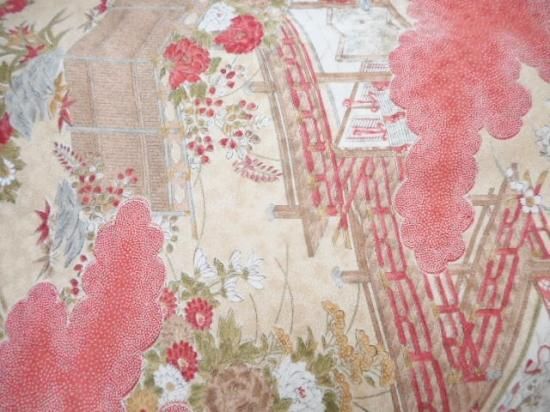 ベージュ系の地に、赤系、茶系等で梅、牡丹、菊、萩、菖蒲等の柄が染められております。