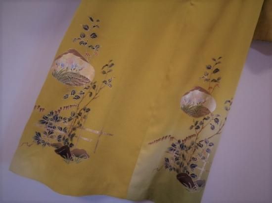 辛子色系からカーキ色系のお色のぼかし染に、牡丹、桜、椿、菖蒲等の柄が染められております。