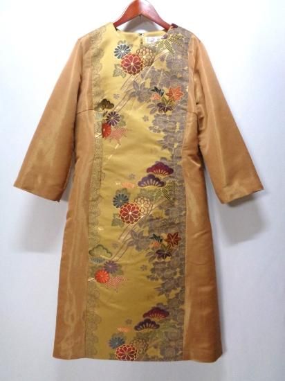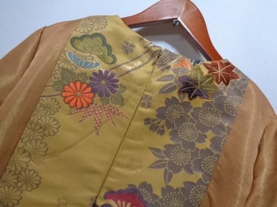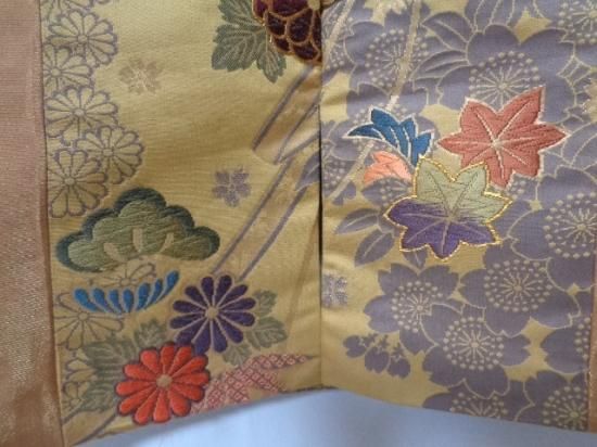 柄は織りによって施されており、見頃の両端はベージュ系と金色系をベースにした地、センター部分は辛子系の地に、多彩なお色の糸で季節の花々等の柄が織られております。
