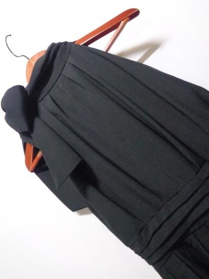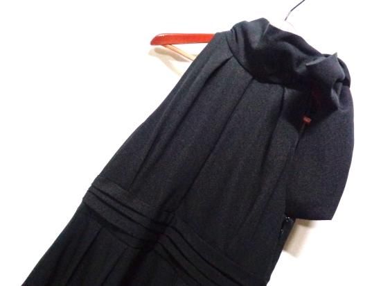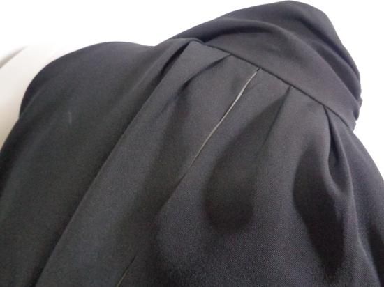 首元は、横ボタンで留めていただき、後襟中心は深く空いており、さりげなく肌が見える様に致しました。(襟から下へ約17〜18cm空いております)