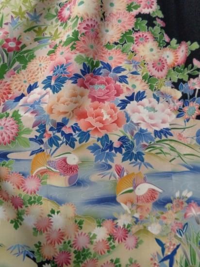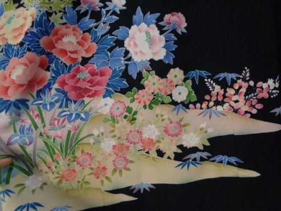 黒系の地に、京加賀友禅の様な柄が施されております。