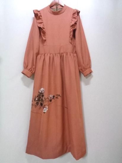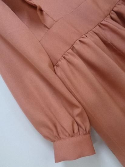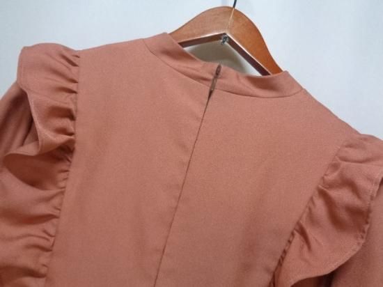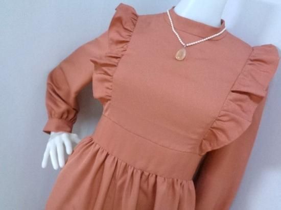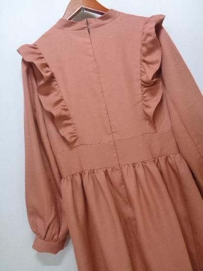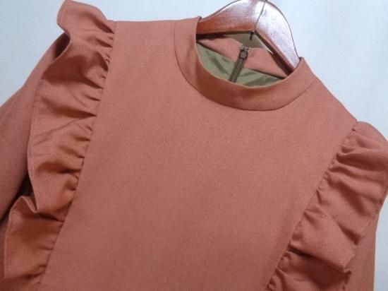 スタンドカラーに、可愛らしいフリルを入れた、ギャザーワンピースでございます。