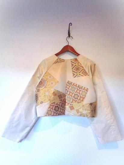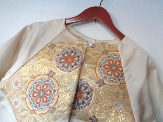 アイボリー系の地に、金色系や多彩なお色の糸で花紋が織られております。