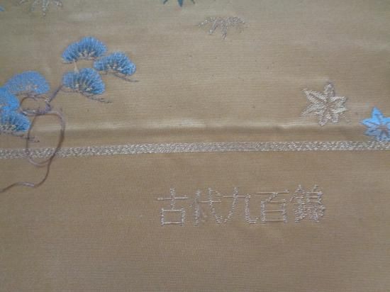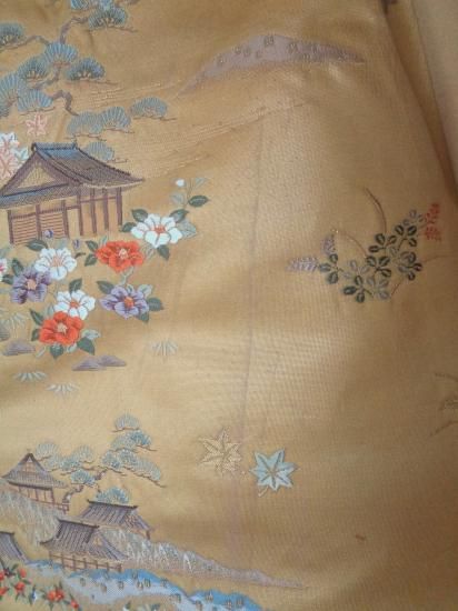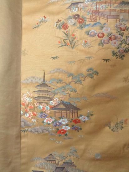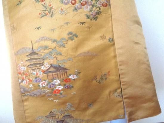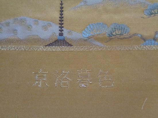 柄は織りによって施されており、キャメル系の地に多彩なお色の糸で、五重塔や季節お花々等が織られております。