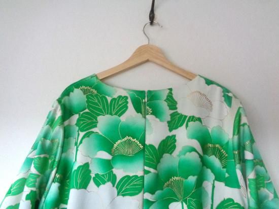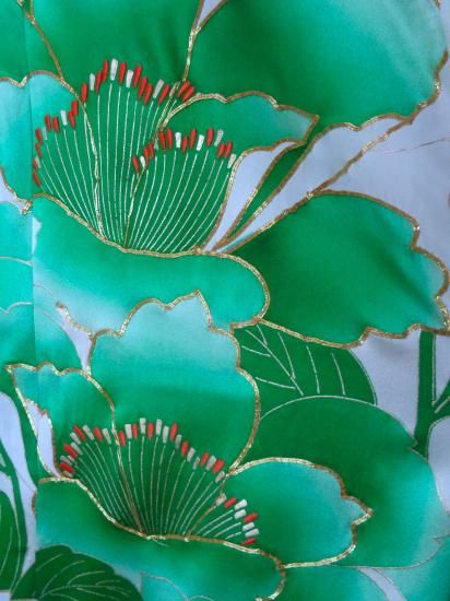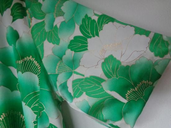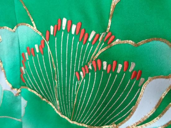 白系の地に緑の牡丹の様な柄が染められており、豪華な糸目刺繍が施されております。